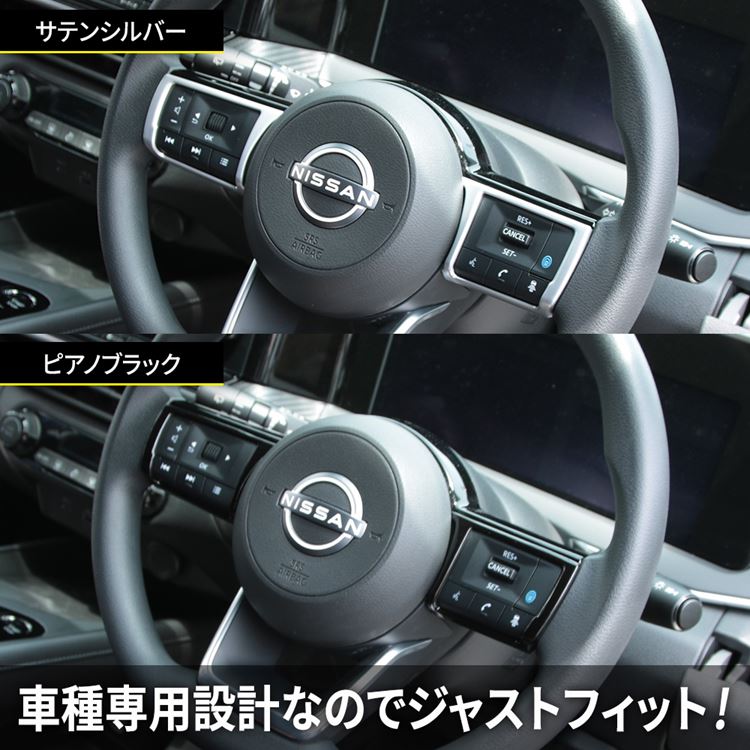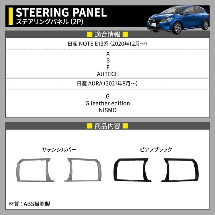商品名 日産ノート E13系 ステアリングパネル 適合車種 日産ノート E13(NISSAN NOTE) 【年式:2020(令和2)年12月〜】 X S F AUTECH ※2WD/4WDを問わずお取り付けいただけます 素材 ABS樹脂 カラー サテンシルバーピアノブラック パーツ数 2 商品説明(仕様) ★ステアリングハンドルにスタイリッシュさと高級感をプラス! ★純正装着済みのステアリングとの...