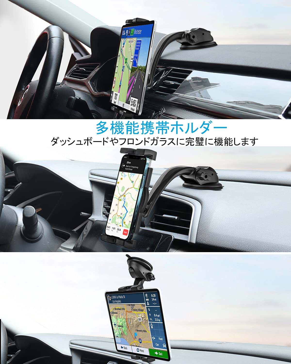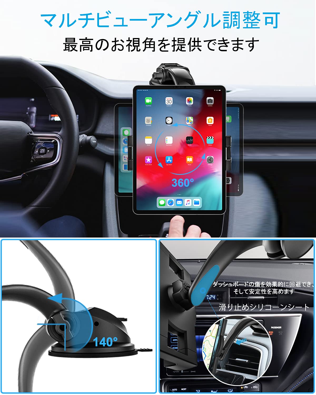 【2023新モデル】EXSHOW 車載ホルダー ダッシュボード車タブレットホルダー 粘着ゲル吸盤式タブレットスタンド携帯マウント 車 メーター超強力吸引力 サクションカップマウントタブレットホルダー チューブ フロンドガラス取り付けるipad車載 360度回転 自由調節 日本語