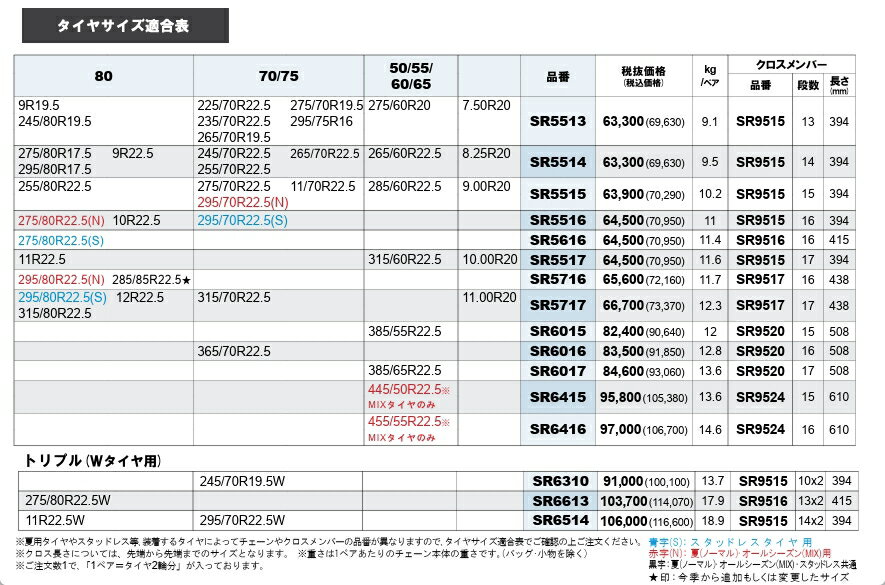<セット内容> チェーン本体 … 1ペア ゴムバンド … 4本 ハンドフッカー … 1本 取扱説明書 … 1部 作業用手袋 … 1組 ■必ずタイヤサイズをご確認のうえ適合するものをお求め下さい。 ■タイヤサイズは標準寸法を基準にしていますが、タイヤ銘柄・摩耗度・空気圧・ホイールサイズ等の条件により多少異なる場合があります。 ■車種・タイヤによってはお取り付けできない場合がございます。 ※装着不可車...
